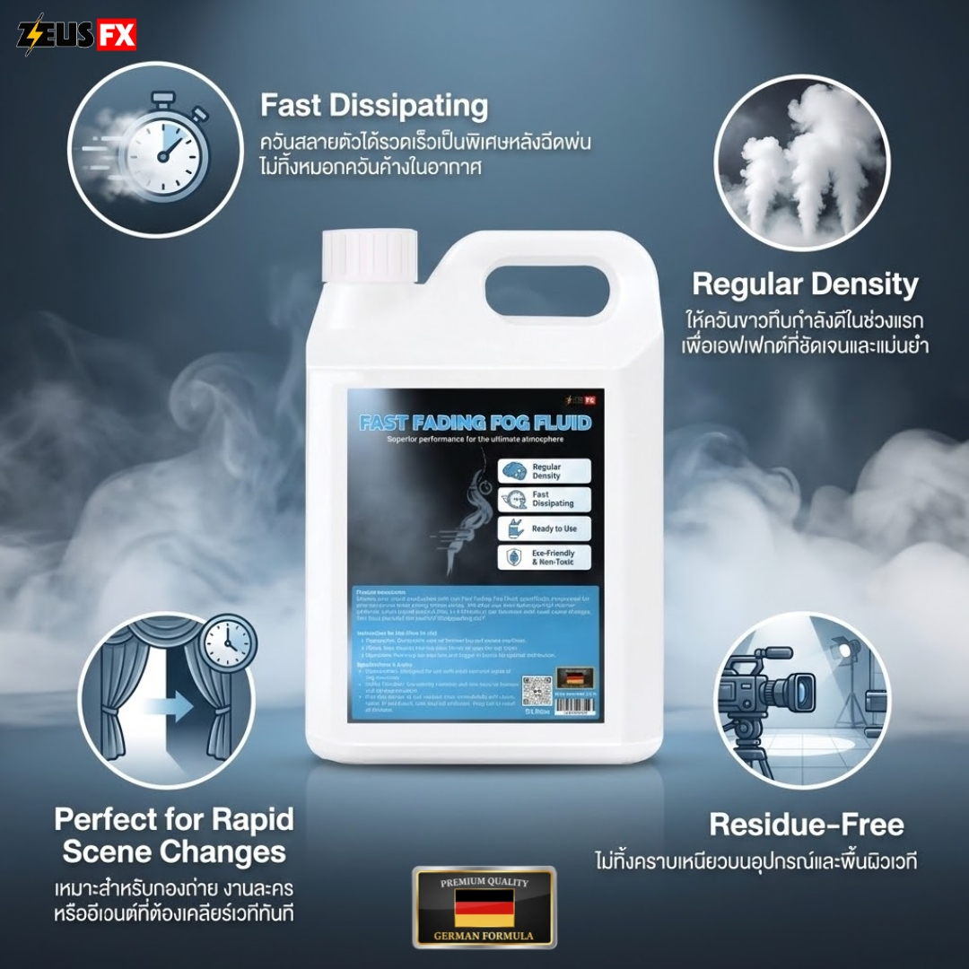 • สลายตัวรวดเร็ว (Fast Dissipation): ควันสลายตัวเร็วกว่าสูตรปกติ 3-5 เท่า ไม่รบกวนมุมกล้องหรือการแสดงช่วงถัดไป