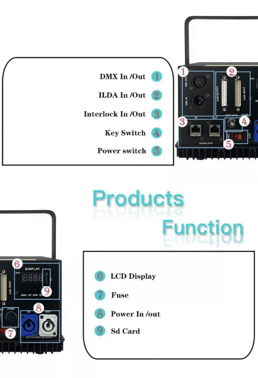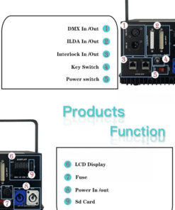 - ILDA Control (Optional): รองรับการควบคุมผ่านซอฟต์แวร์ ILDA สำหรับกราฟิกที่ซับซ้อน